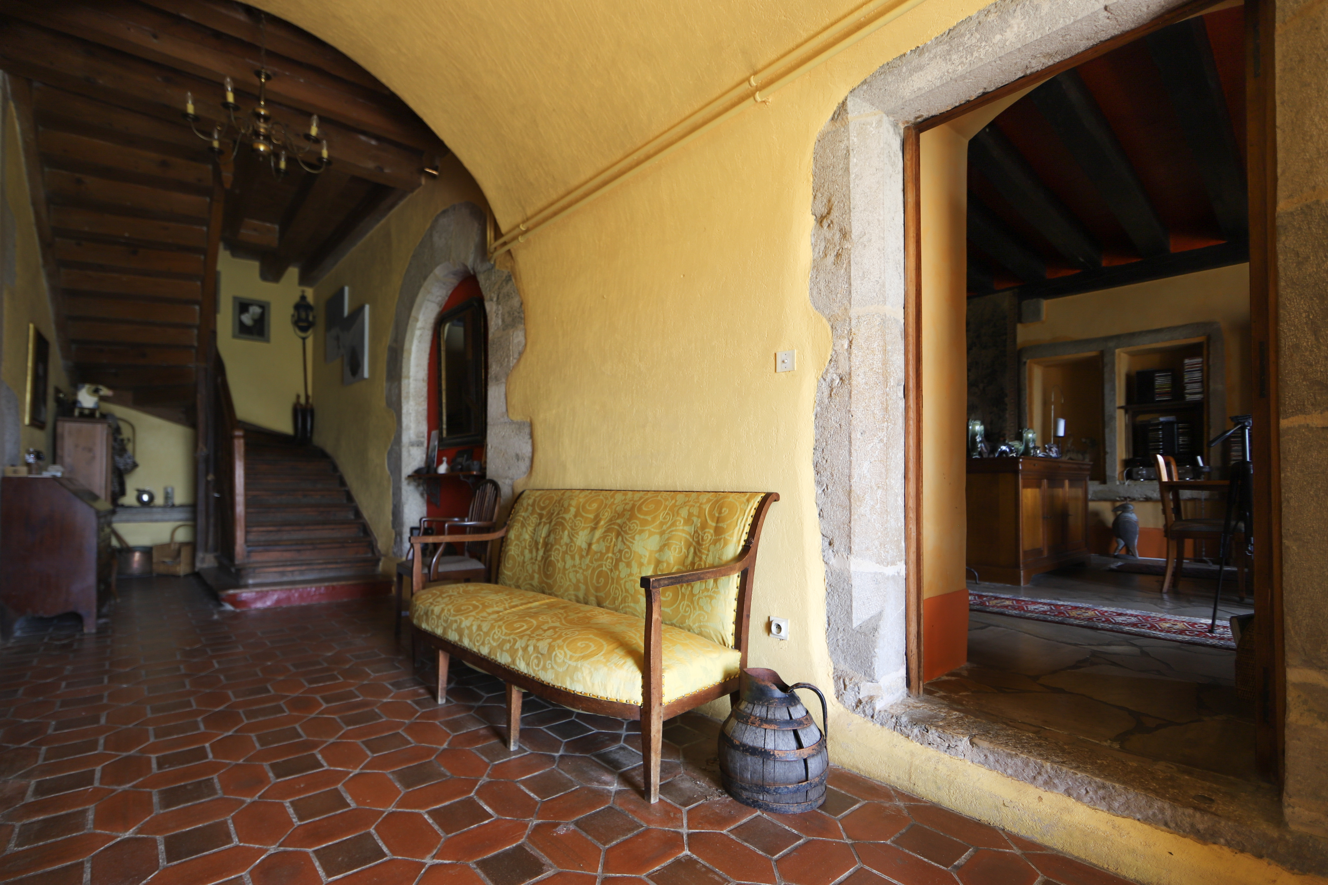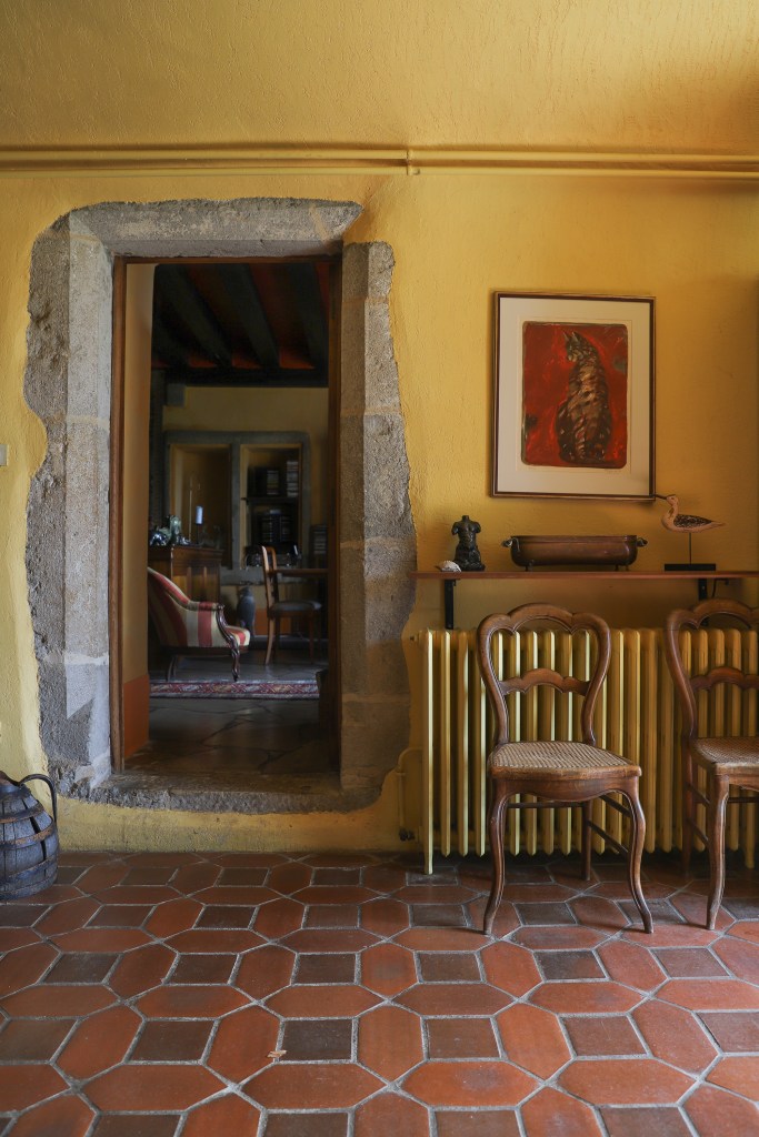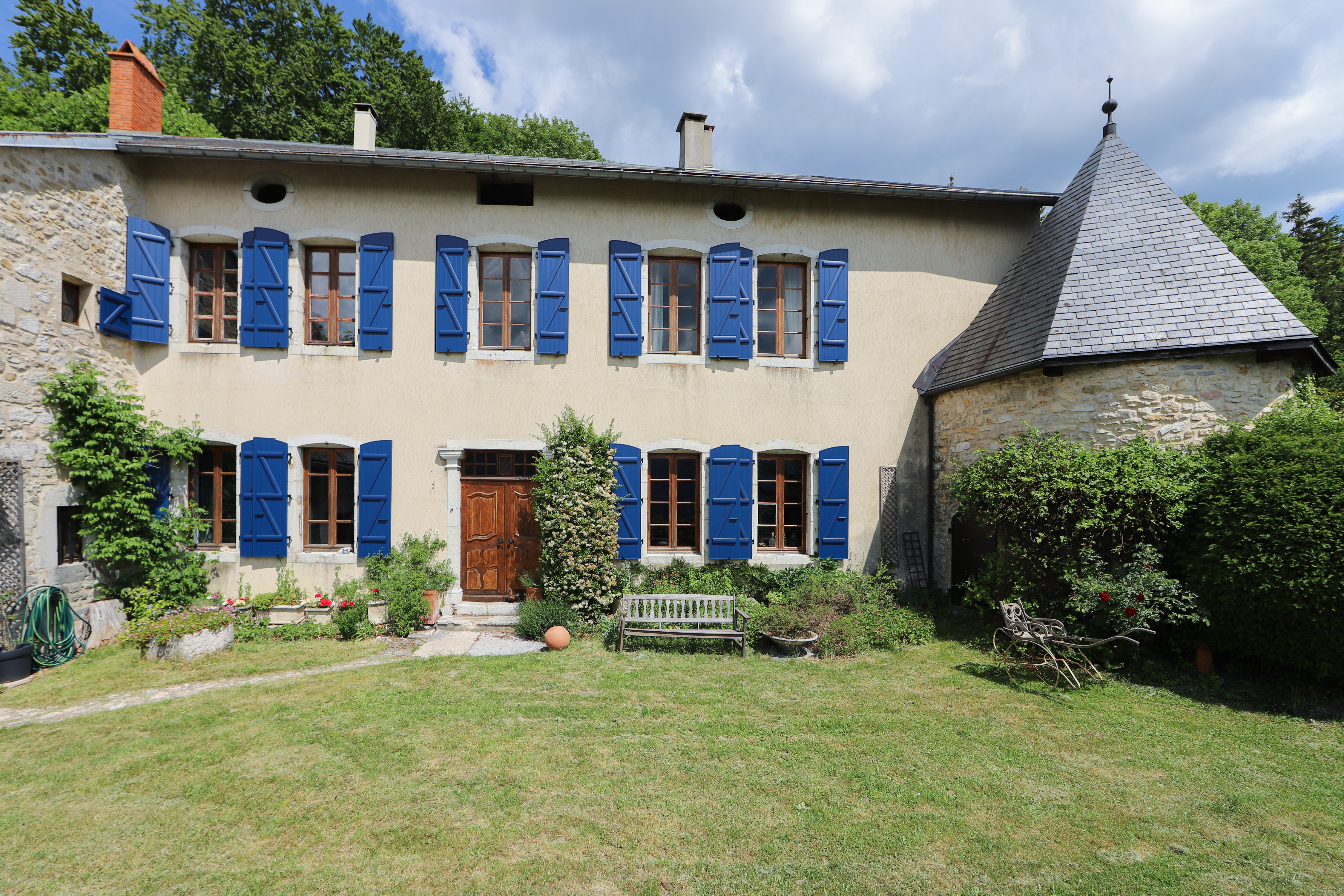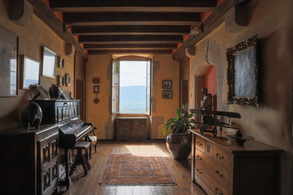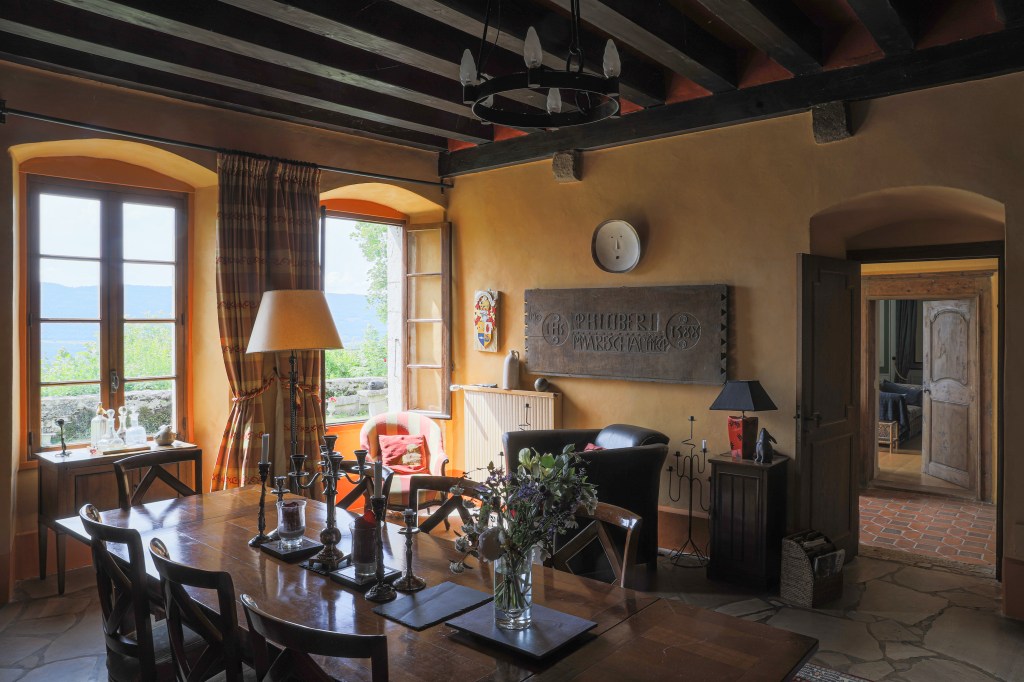 The Château de Sothonod, a family home, is located in a small hamlet of that name in the Ain department: an unspoiled corner of France. It is a maison forte — or fortified house — dating back to the 10th century, with ramparts and one tower left out of the original four. The building was set on fire during the French revolution and one can still see blackened beams in the attics. The Catholic Saint Arthaud was born in a top bedroom in 1101 and lived until the remarkable age of 105…which is maybe why he was canonized!