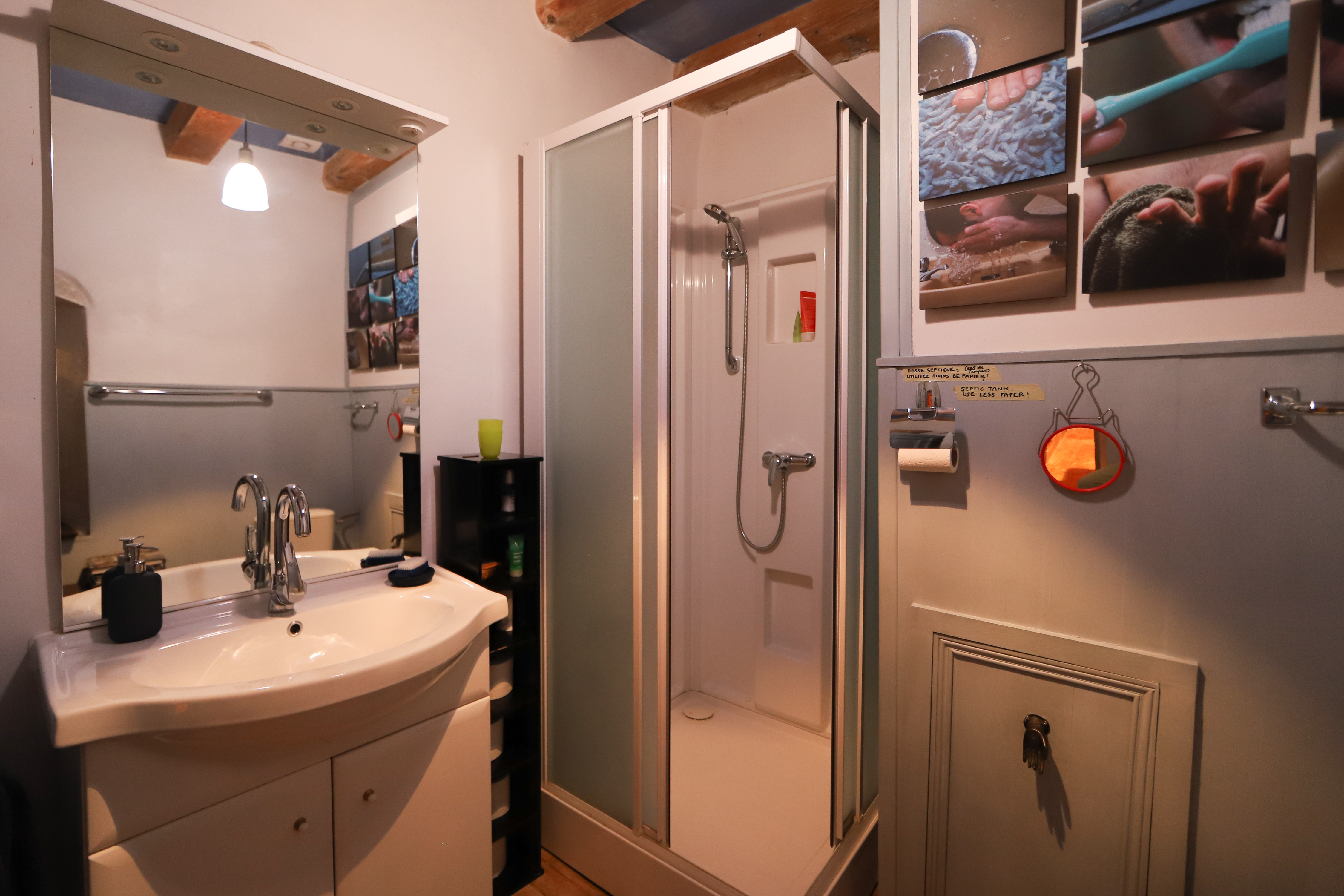 Meals: given 48h notice, we can prepare evening meals (delicious and varied vegetarian, cheese, dessert, soft drinks, tea or coffee: €28 to €40 depending on fresh ingredients from the market). We stock a range of local Bugey wines, which you are welcome to purchase from us… or you can bring your own. We try to be as environmentally friendly as possible: most of our produce is local, seasonal, fresh and organic, water bottles are reused, paper recycled, waste minimised and so on.