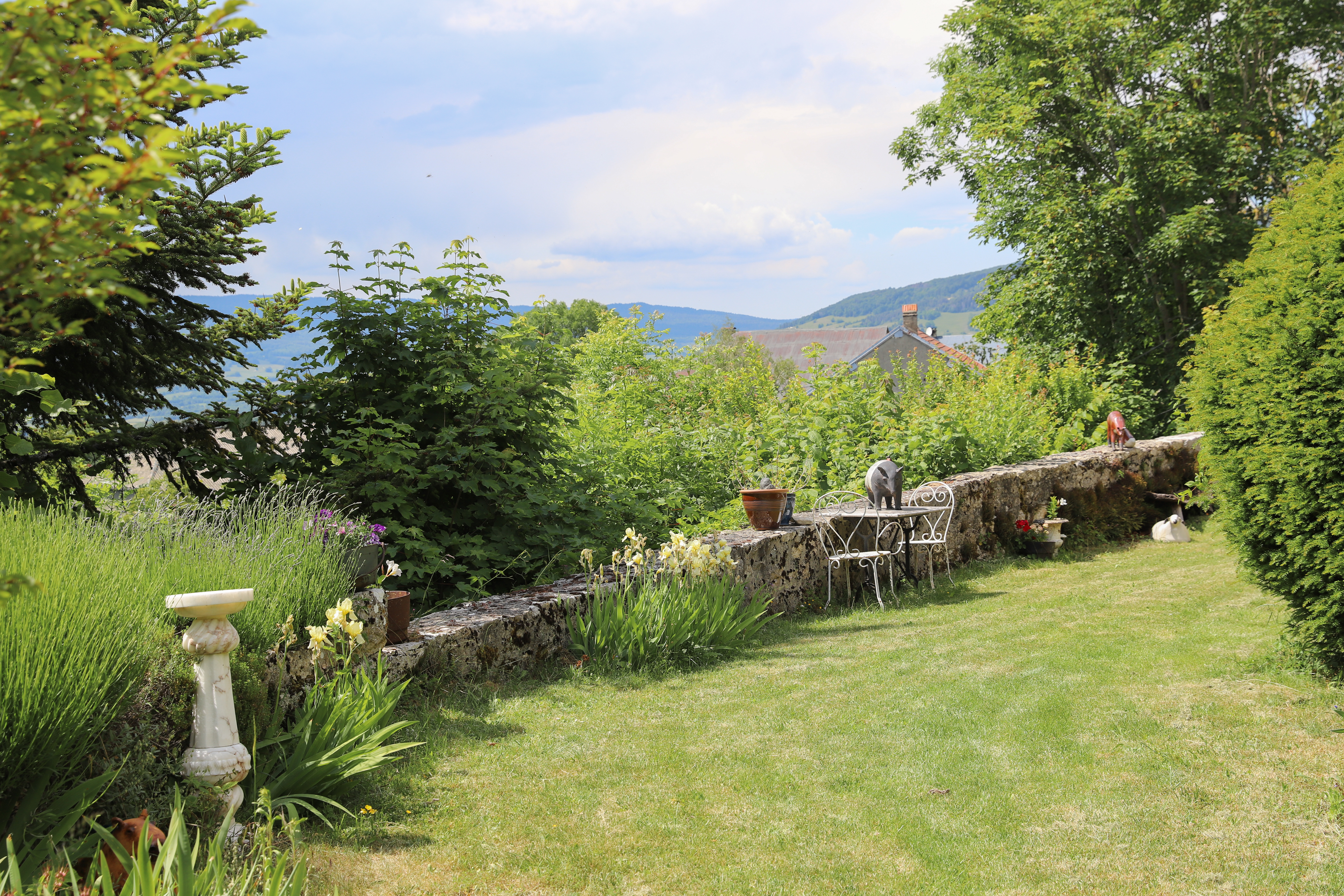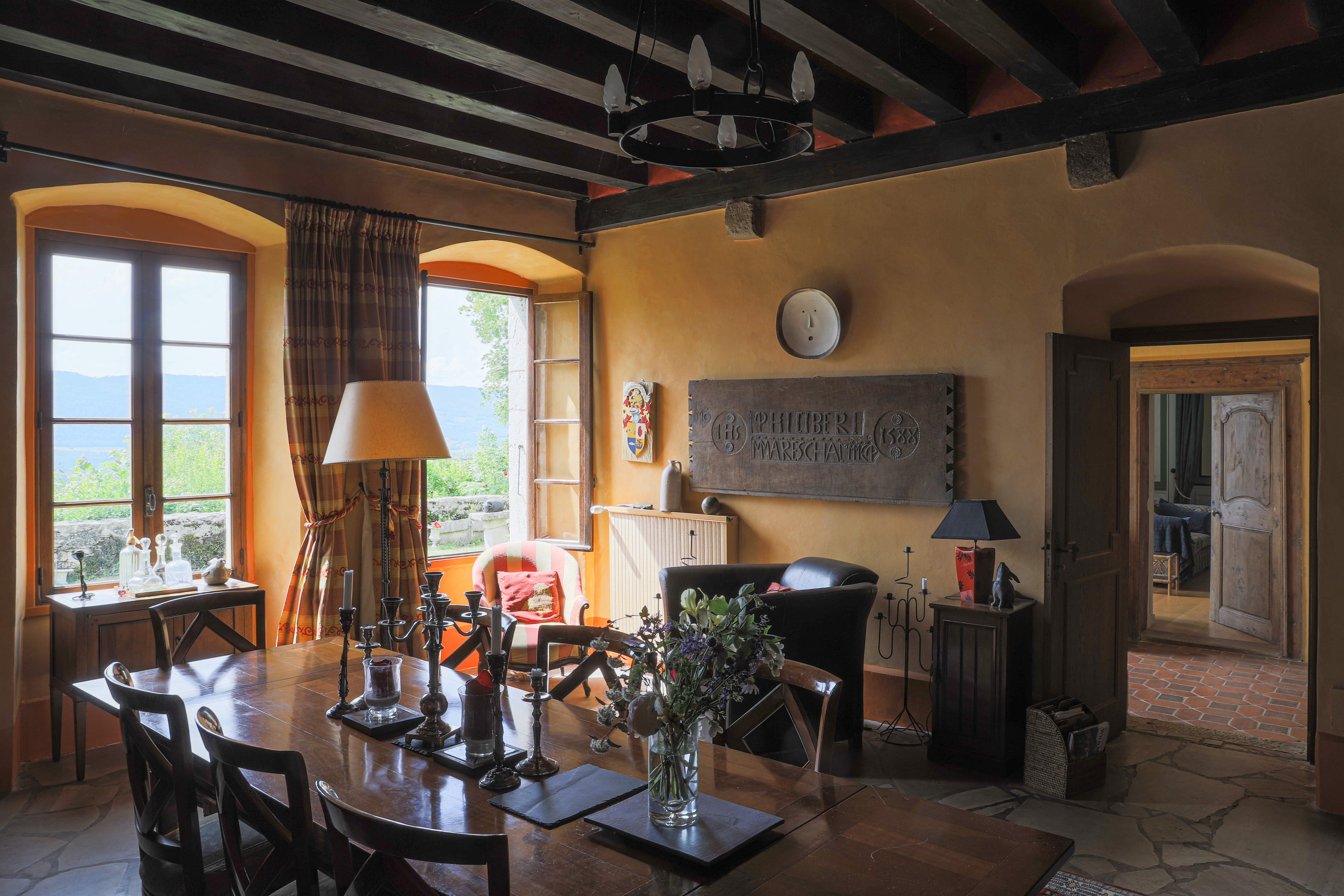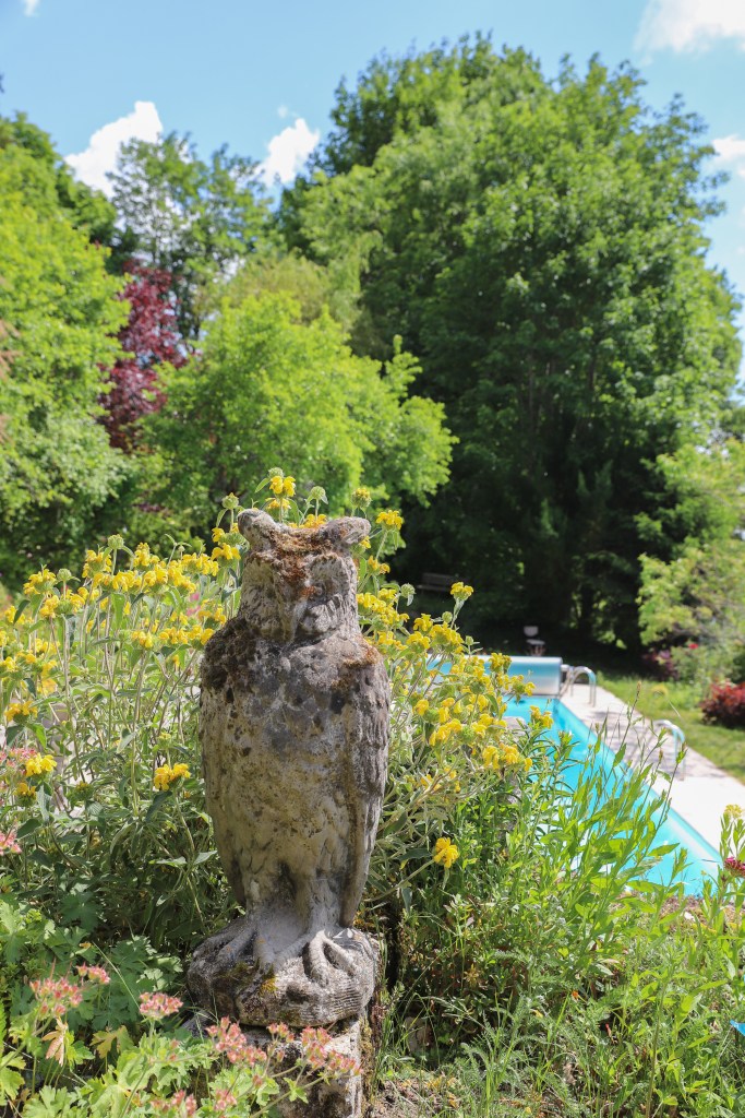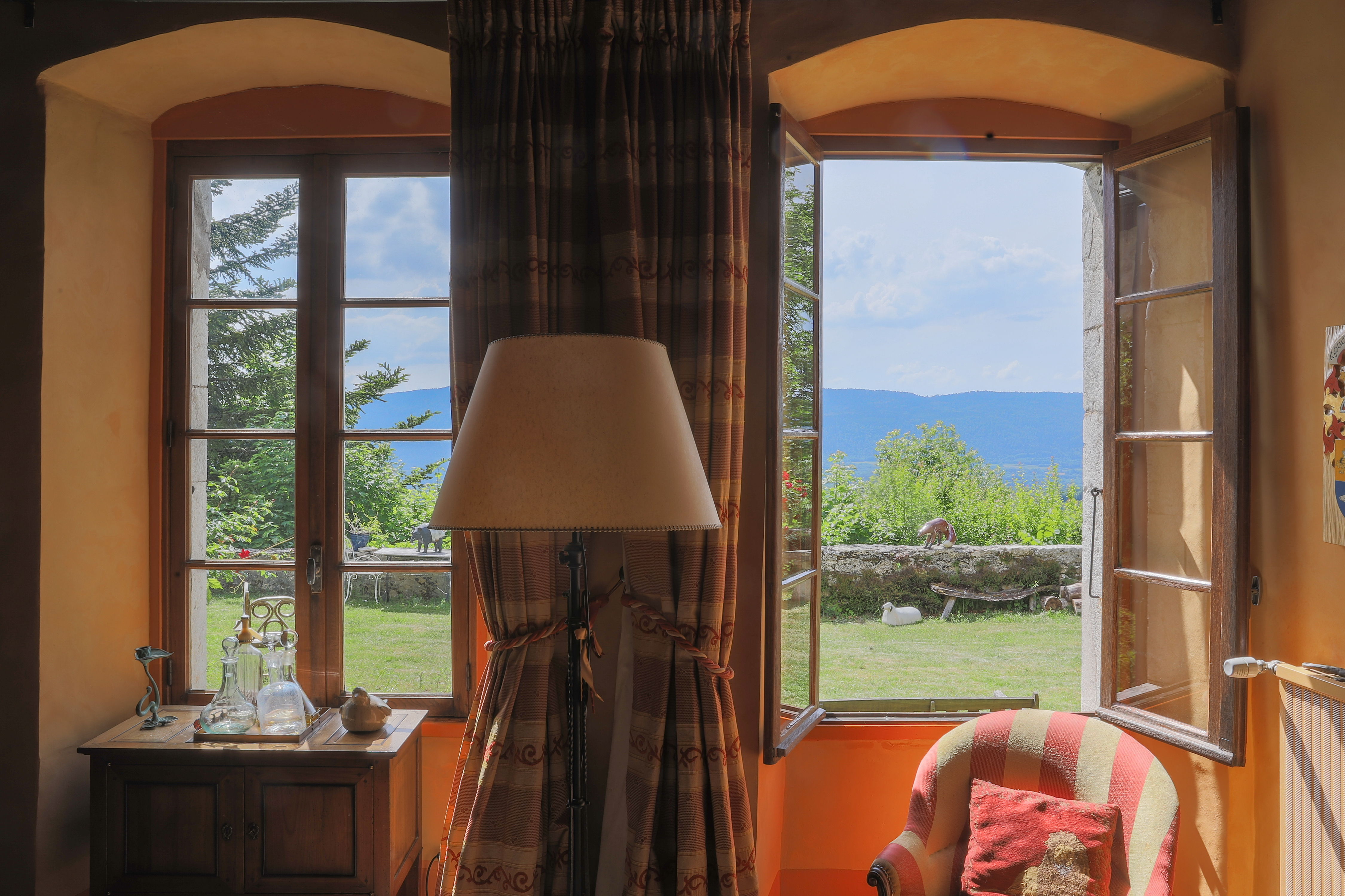 “Six of us spent 4 nights at the Chateau during a work trip to the region. The Chateau de Sothonod is a beautiful historical maison forte located in a small town in the Jura about an hour’s drive from Geneva – the pictures on this website are accurate and really do capture the feeling of the place. It is filled with eclectic artwork – pictures, photographs and sculptures – many made by Zandra (who owns the house), with beautiful gardens with flowers and sculptures outside. I stayed in a small back room where a French saint was apparently conceived many centuries ago. Beds are excellent and it is quiet – we all slept very well. There is a swimming pool (made for laps) – heated and open in the summer months (it was just being opened when we were there). Zandra speaks perfect English and French, and is a joy to talk with. She lives in the chateau, meaning that there are private and public parts to it. She cooks breakfast for guests – when we were there, we had strong coffee (as I like), croissants, excellent home-made muesli, bread and jam, yogurt or fromage frais and fruit juices. This is not a place for people who seek a modern standardized hotel (shared bathrooms – never a problem for us, no TVs, but there is wifi) – rather it is a great place for people who want something with real character. All of us would be eager to return in the future.“